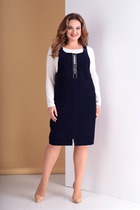 Сарафан из трикотажного полотна «кулирка» в сочетании двух видов в единой цветовой гамме: с мелкоузорчатым набивным рисунком, имитирующим ткацкое переплетение «рогожка» и с рисунком в мелкую клетку, отрезной по линии талии, с V-образной горловиной, центральной бортовой застежкой на обметанные петли и пуговицы и вышивкой на левой полочке лифа. Горловина спинки и проймы окантованы основным материалом. Юбка присборена по шву соединения с лифом. Съемный завязывающийся пояс фиксируется двумя шлевками из окантовки, вставленными в боковые швы на уровне талии.