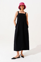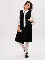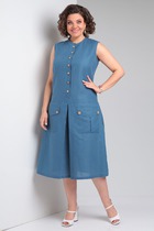 Сарафан женский из тканого штапельного полотна с набивным рисунком, удлиненный, слегка расширенный книзу, с широкими бретелями, глубоким вырезом горловины, центральной бортовой застежкой на обметанные петли и пуговицы, карманами и разрезами в боковых швах. На полочках - вытачки в области груди. Изделие укомплектовано съемным поясом, завязывающимся вокруг талии.