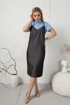 Сарафан молодежный из тканого полотна «штапель» с набивным рисунком, с углубленной V-образной горловиной, на узких бретелях, отрезное по линии талии, с расклешенной юбкой, собранной с помощью эластичной тесьмы. Горловина и проймы окантованы основным материалом. Переднее полотнище юбки из двух частей, в соединительном шве выполнен разрез. Изделие комплектуется съемным поясом, завязывающимся на талии.
