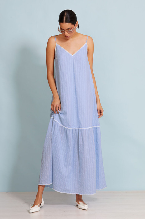 Изделие на хлопковой подкладке. Длина maxi. Свободное в талии и бедрах, в духе минимализма. Изделие без застежки. V-образный вырез горловины и спинки. Изделие отрезное выше линии колена. Нижняя часть платья собрана на сборку. Изделие декорировано хлопковым кружевом.