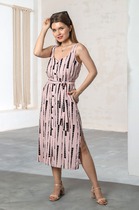 Сарафан молодежный из трикотажного полотна «кулирка» с набивным рисунком в полоску, полуприталенного силуэта на тонких бретелях, с карманами в боковых швах. Вырез горловины полочки и спинки обработаны притачной планкой из основного материала, проймы окантованы.
