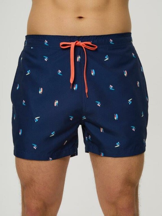 Мужские укороченные плавки из мягкого полотна без эластана,  с принтом - серфер.  Боковые карманы с двух сторон. Внутренние плавки из мягкой эластичной сетки. Сзади, по линии талии широкая резинка, спереди - регулируемый шнурок. Подгиб по нижнему краю шорт.