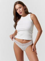 Трусики Brazilian со средней посадкой выполнены из эластичного кружева . Декоративная резинка по талии. Мягкая резинка по краю ножек, подгиб и плоский шов сзади.  Ластовица из хлопка.