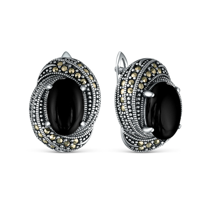 Совместные покупки Сургут Ювелирные украшения и бижутерия Серьги — Серьги из чернёного серебра с натуральным ониксом и марказитами 925 пробы HE1105