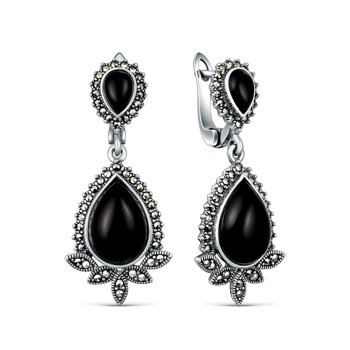 Совместные покупки Сургут Ювелирные украшения и бижутерия Серьги — Серьги из чернёного серебра с ониксом и марказитами 925 пробы HE1028-ON-LK