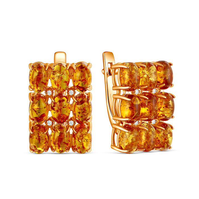 Серьги из золочёного серебра с коньячным янтарём и фианитами 925 пробы 05-802-01