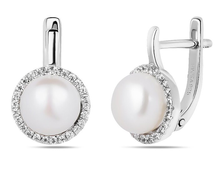 Серьги из серебра с культивированным жемчугом и фианитами родированные С50273