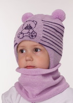 Двойная шапочка с небольшими помпонами на макушке, подклад выкроен из хлопкового полотна и полностью пришит. Утеплитель изософт. Спереди вывязан медвежонок, бусинки-глазки и носик пришиты вручную. Аккуратные завязки без узлов и наконечников.