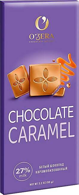 Нежный белый карамельный шоколад с содержанием молока 27 %.