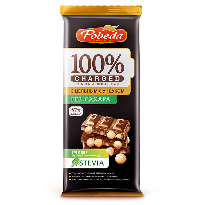 Коллекция «Чаржед» – это умный шоколад нового поколения, в котором традиционная рецептура разработана с учетом современных тенденций. В темном шоколаде Charged с цельным фундуком мы не используем сахар. Вместо него добавлен натуральный сахарозаменитель – стевиолгликозид. Стевиолгликозид – очищенный экстракт растения стевии (Stevia rebaudiana), который придает листьям сладкий вкус. Растение стевия родом из Южной Америки. Это уникальный природный сахарозаменитель, не имеющий аналогов, благодаря особенной сладости и натуральному происхождению. А цельный фундук всегда идеальная пара к шоколаду. С шоколадом «Победа» без сахара придерживаться ЗОЖ – просто и вкусно.