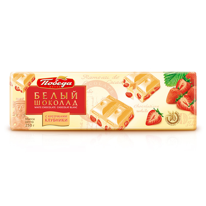 В отличие от других видов в состав белого шоколада добавляется только какао-масло без какао тертого, благодаря чему белый шоколад имеет такой нежный сливочный цвет. Кондитерская фабрика «Победа» придерживается европейского стандарта в рецептуре этого изысканного продукта – не менее 20 % какао-масла из Кот-д’ Ивуар, молоко и натуральная ваниль делают его вкус по-настоящему насыщенным и выразительным.Что может быть лучше? Только если добавить клубнику! Так звучит настоящее удовольствие.