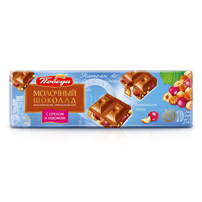 В основе рецепта молочного шоколада «Победа» – качественные какао-бобы из Ганы и Кот-д’Ивуара, обжаренные по особой технологии, которая позволяет в полной мере сохранить полезные свойства шоколада. Шоколад с идеальным составом: только натуральные какао-бобы (30 %), цельное молоко, дробленый лесной орех и иранский изюм – он повышает иммунитет, заряжает энергией, помогает бороться со стрессом.