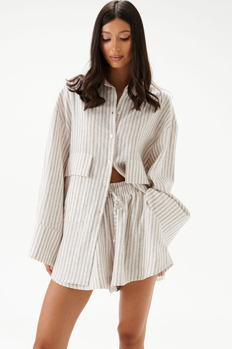 Шорты выполненные из льняного полотна. Характеристики: широкие, короткие, пояс притачной на резинке, кулиска. В боковых швах карманы с отрезным бочком. Низ обработан в подгибку с закрытым срезом. Длина по боковому шву 34 см