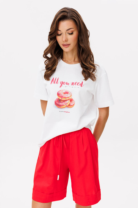 Шорты льняные на притачном отстроченном поясе со шлевками, в которые втянут шнурок из основной ткани с наконечниками. По переду со складками от притачного пояса и карманами в боковых швах с наклонным входом. По низу шорт манжета.