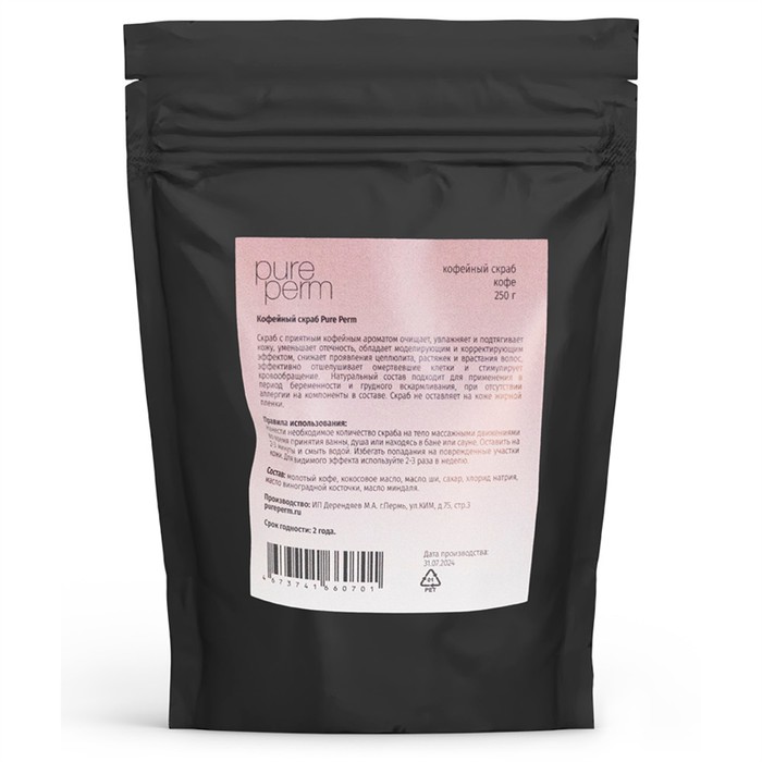 Тип: Скраб для тела Вес: 250 г Срок годности: 24 мес. Условия хранения: Условия хранения- хранить при t от +5°С до +25°С, в сухом, в защищенном от света и недоступном для детей месте Страна изготовитель: Россия Торговая марка: Pure Perm Изготовитель: ИП Дерендяев Максим Алексеевич Декларация соответствия ТР ТС: ЕАЭС N RU Д-RU.РА07.В.08752/23 Технические условия: ТУ 20.42.15-007-0184188822-2023