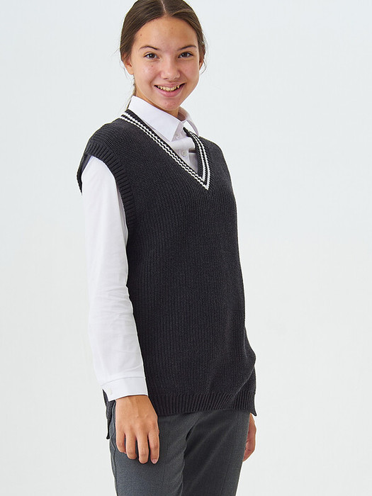Стильный вязанный жилет унисекс с V-образным вырезом из хлопковой пряжи прямого фасона. Боковые швы дополнены разрезами. Низ жилета, пройма рукавов и вырез горловины оформлены фактурной резинкой, вдоль горловины резинка контрастного цвета. Жилет выполнен из 100% хлопка, что обеспечивает отличную воздухопроницаемость и комфорт в повседневной носке.