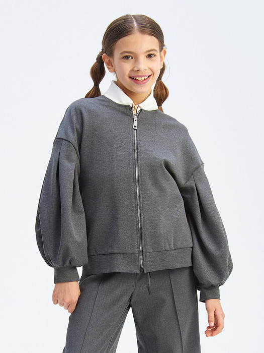 Трикотажный бомбер для девочки с длинными объемными рукавами с манжетами. Застегивается на металлическую молнию. Эластичные волокна в составе обеспечивают комфорт в движении на протяжении всего дня.