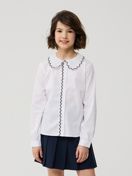 Стильная блуза из смесового хлопка полуприлегающего силуэта с отложным воротником и длинными рукавами. Край воротника и планки декорирован фестонами синего цвета. Центральная застёжка на планку с пуговицами. Высокое содержание хлопка в составе обеспечивает отличную воздухопроницаемость и комфорт в повседневной носке. Отличный вариант на каждый день.