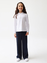 Трикотажное поло для девочки полуприлегающего силуэта с длинными рукавами. Край рукава с манжетами на подвязе и с фактурным краем. Воротник отложной со стойкой. Укороченная застёжка на переде на молнию обеспечивает идеальную посадку.