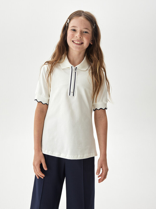 Трикотажное поло для девочки полуприлегающего силуэта с короткими рукавами. Край рукава с манжетами на подвязе и фактурным краем. Воротник отложной со стойкой . Укороченная застёжка на переде на молнию обеспечивает идеальную посадку.