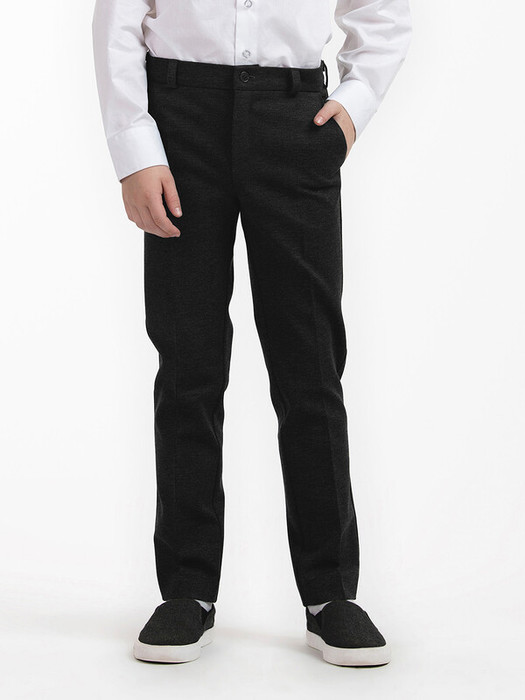 Брюки зауженные из трикотажа джерси для мальчика. Пояс с еврорезинкой сзади. На передней части брюк боковые карманы, горизонтальные защипы и застёжка - гульфик на молнии. На правой задней половинке брюк - карман с узкой листочкой. Отличный вариант на каждый день.