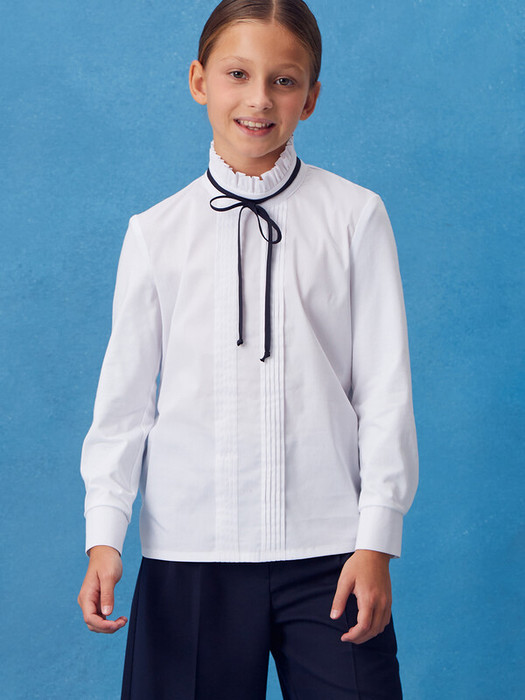 Романтичная блузка из смесового хлопка полуприлегающего силуэта. Воротник-стойка дополнен стильным бантиком из темно-синей ткани и декоративными элементами по переду изделия. Длинный рукав на манжете. Высокое содержание хлопка в составе обеспечивает отличную воздухопроницаемость и комфорт в повседневной носке. Отличное решение для создания романтичных образов маленькой модницы.
