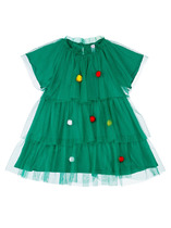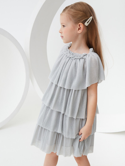 Платье силуэта трапеция на хлопковой подкладке. Многослойность—главное украшение изделия: четыре яруса ткани, дополнены двойными оборками из плиссированной сетки. На платье отсутствуют застёжки —девочка сможет спокойно надеть его без лишних усилий. Горловина с резинкой, рукава дополнены оборками.