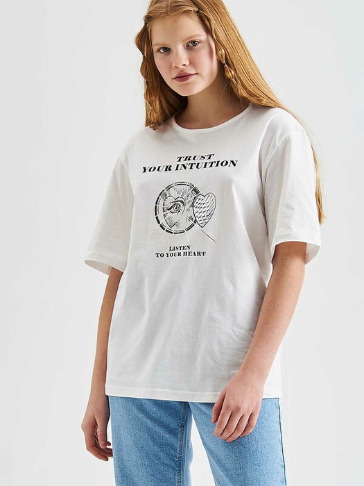 Трикотажная футболка свободного силуэта с принтом и фигурным вырезом по спинке изделия.