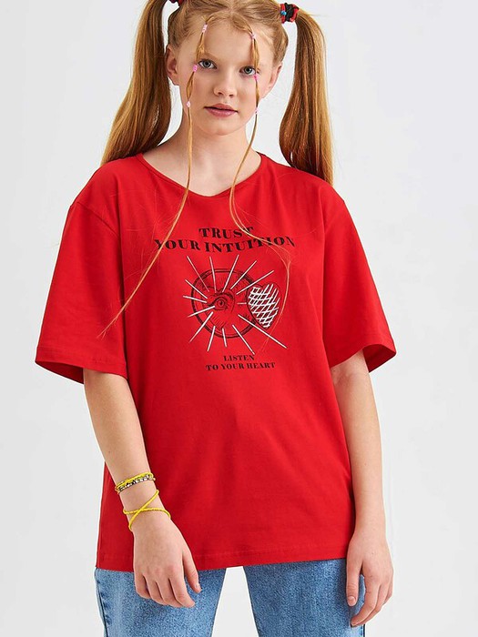 Трикотажная футболка свободного силуэта с принтом и фигурным вырезом по спинке изделия.