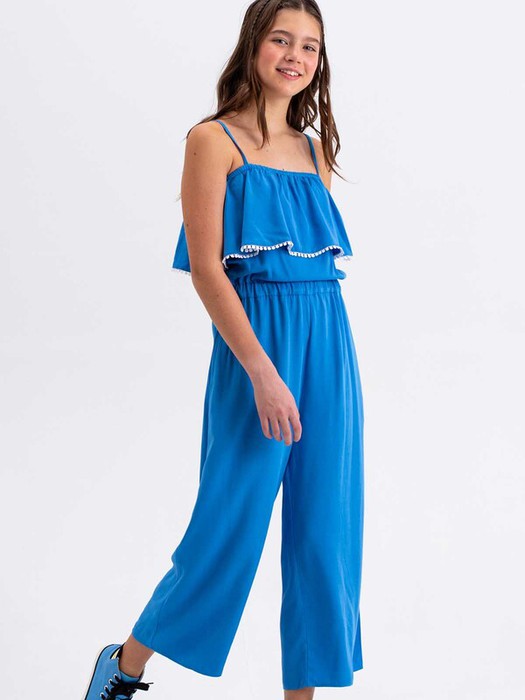 Легкий комбинезон из струящейся вискозы. Лиф декорирован воланом с легкой сборкой, бретели регулируются по длине. Пояс на резинке, в боковых швах карманы.