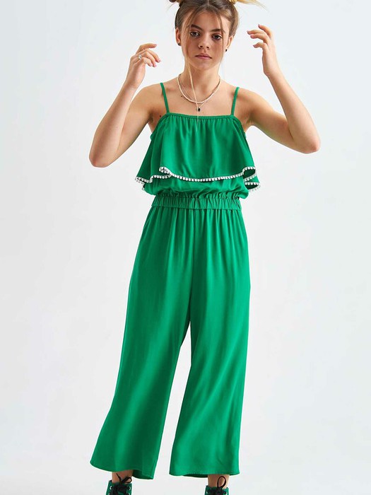 Легкий комбинезон из струящейся вискозы. Лиф декорирован воланом с легкой сборкой, бретели регулируются по длине. Пояс на резинке, в боковых швах карманы.