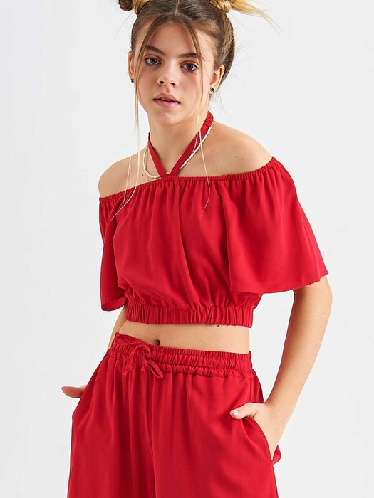 Романтичная укороченная  блузка из вискозы с вырезом  ""каре"". Горловина собрана на резинку, что позволяет носить блузку в разных вариантах, так же дополнена съемной бретелью на шею. Низ на широкой резинке.