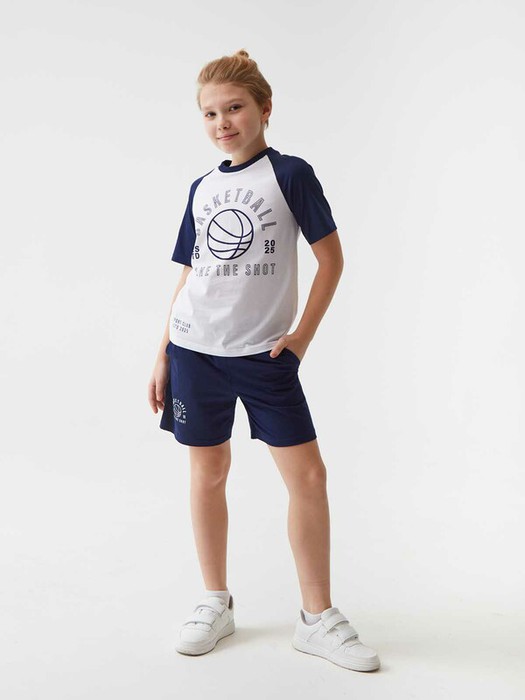 Трикотажный комплект из футболки и шортов. Футболка с принтом BASKETBALL TAKE THE SHOT (с англ. «баскетбол сделай бросок»). Мягкий трикотаж из 100% хлопка. Прямой крой с рукавами реглан. Горловина и рукава контрастного цвета. Однотонные шорты повторяют принт футболки. Мягкий трикотаж из 100% хлопка. Свободный крой, средняя посадка, эластичный пояс с кулиской. Функциональные скошенные карманы по бокам. Размерный ряд 116 – 176 см.