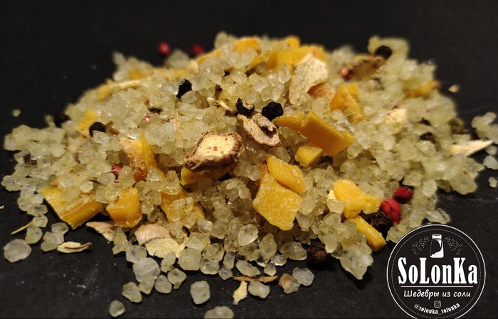 Эпатажно-эксцентричное сочетание сладкого манго и большого количества разного вида перца. Белый, черный, розовый и душистый, он цветными вкраплениями проглядывает из морской соли. Но это не просто соль, на ее кристаллах такое количество пюрированного манго, что они изменили и свой цвет и свою структурность. Соль не сыпется она "перетекает" как барханы песка в пустыне. Кусочки вяленого манго придают ей ещё больше вкуса и аромата. А высушенный имбирь дополняет всю композицию своей остротой и пряностью.