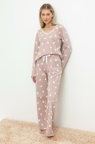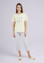 Сорочка на тонких бретелях и с отрезным лифом. Вырез на запах, обработан косыми планками с кантом из основной ткани, под грудью белая окантовка. По низу сорочки расположен выпуклый цветочный принт по ткани белого цвета. Сорочка расклёшенная к низу и обработана по низу оверлоком. Можно носить как сарафан.