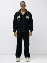 Спортивный костюм из полиэстеровой ткани с изнаночным начесом, в стиле ретро спорт. Куртка свободного силуэта на поясе, воротник - стойка, куртка застегивается на молнию. Карманы куртки и брюк прорезные с планками, с молниями. Рукава покроя реглан. По груди куртки настрочены контрасные полосы. Посадку по фигуре обеспечивает декоративная трикотажная резинка с полосками. Брюки прямого силуэта. Пояс по линии талии дополнительно регулируется шнурком.