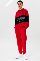 Спортивный костюм из хлопкового трикотажного полотна .Куртка костюма на поясе, с воротником-стойкой, с капюшоном, застегивается на молнию. Рукава втачные. Несколько деталей костюма изготовлены из водонепроницаемой плащевой ткани в тон изделия - это капюшон,кокетка куртки, вставка левого рукава и боковые вставки брюк. Карманы куртки и брюк с молниями, распологаются в рельефах. На рукаве куртки слева предусмотрен дополнительный карман, он также с молнией. Капюшон ветрозащитный, с высокой цельнокроенной стойкой. Пояс и манжеты куртки собраны на эластичную резину. Брюки прямые, зауженные книзу. Пояс брюк по линии талии так же с эластичной резинкой, дополнительно регулируется шнуром. На левом рукаве и под левым карманом брюк нашиты шевроны с фирменным логотипом.