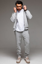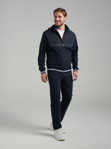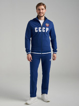 Спортивный костюм из хлопкового трикотажного полотна. Куртка костюма на поясе, с воротником-стойкой, с легким капюшоном, застегивается на молнию. Рукава втачные. Несколько деталей костюма изготовлены из водонепроницаемой плащевой ткани в тон изделия - это капюшон, вставки рукавов, переходящие в плечевые кокетки, бочки куртки, боковые вставки брюк. Ветрозащитная планка из плащевой ткани закрывает молнию. Все карманы комплекта застегиваюся на молнии и расположены в швах боковых деталей, Лицевая часть капюшона регулиреутся резиновым шнуром с помощью металлических фиксаторов.Пояс, воротник и манжеты куртки изготовлены из эластичного подвяза. Брюки прямые, зауженные книзу. Пояс брюк по линии талии с эластичной резинкой так же дополнительно регулируется шнуром. На левой груди и под левым карманом брюк нашиты шевроны с фирменным логотипом