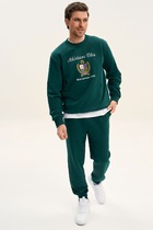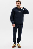 Мужской спортивный костюм из плотного трикотажа с петельной изнанкой. Верх комплекта - толстовка-худи с капюшоном, с накладным карманом "кенгуру". Рукава толстовки втачные, свободные со спущенной линией плеча, с эластичными манжетами. На тактических брюках "Карго" два объемных накладных кармана с клапанамии и еще два кармана в боковых подрезах. Брюки зауженны книзу на резинку. Пояс брюк на резинке, по линии талии дополнительно регулируется шнуром.