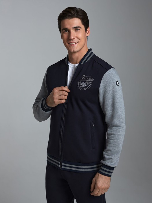 Спортивный костюм из плотного хлопкового трикотажного полотна с изнаночным начесом. Куртка на поясе с воротником, застегивается на молнию. Рукава втачные. Куртка скомбинирована из двух видов полотна, с контрастными рукавами. Яркость изделия подчеркивает клубная вышивка на груди и использование полосатого полотна для пояса, воротника и манжет куртки. Карманы куртки и брюк прорезные, с молниями . Брюки по низу заужены манжетами.Брюки прямого силуэта.Пояс брюк эластичный, по линии талии дополнительно регулируется шнурком.