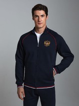 Спортивный костюм изготовлен из плотного хлопкового трикотажного полотна с изнаночным начесом и отделан плотной влагоотталкивающей плащевой тканью. Куртка костюма прямая, с капюшоном, застегивается на молнию. Капюшон, плечевые кокетки, рамки карманов куртки и брюк и нижняя часть задних брючин продублированы плащевой тканью. Комфортный двухшовный капюшон по лицевой части регулируется резиновым шнуром и фиксаторами. Под передней плашевой кокеткой куртки есть поперечная вставка из плотного фактурного трикотажа. Низ куртки и рукавов слегка заужены эластичной окантовкой. Карманы куртки и брюк прорезные, застегиваются на молнии. Пояс и манжеты куртки изготовлены из плотной эластичной трикотажной резинки. Брюки прямые. Пояс брюк по линии талии с эластичной резинкой, дополнительно регулируется шнуром. На левом рукаве шеврон с фирменным логотипом.