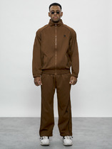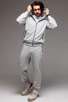 Современная модель мужского костюма из жаккардового трикотажного полотна. Куртка с капюшоном, на молнии, с карманом-кенгуру. Рукава покроя реглан, выполнены из контрастного трикотажного полотна. По низу куртки слегка заужен поясом, рукава с манжетами. Карманы брюк прорезные, наклонные. Низ брюк с манжетами. Пояс брюк эластичный, дополнительно регулируется шнуром. На слева на груди и на левой брючине под карманом - фирменный логотип. На правый рукав логотип нанесен методом термопечати.