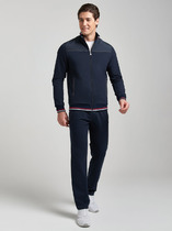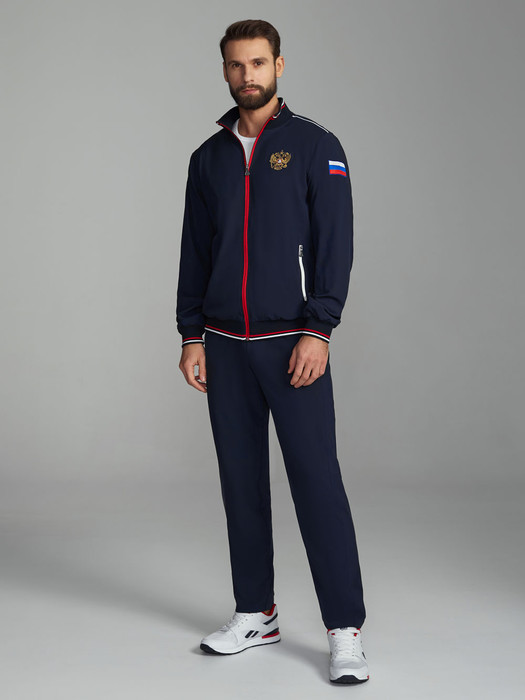 Спортивный мужской костюм изготовлен из легкой плащевой ткани с добавлением лайкры, которая при носке обладает упругим растяжением подобно трикотажному полотну. Куртка на молнии с воротником, с подкладкой из легкой трикотажной сетки. Куртка свободного силуэта, заужена книзу поясом из трикотажной резинки с полосками, воротник- стойка также выполнен из трикотажной резинки. . Карманы прорезные, с открытыми молниями. Крой рукава - втачной, низ рукава слегка заужен трикотажным манжетом с контрастными полосами. Слева на груди вышивка "герб России", На левом рукаве вышивка аппликация - флаг России, на спине надпись RUSSIA. Все вышивки выполнены цветными шелковыми нитями. Брюки костюма на сетчатой подкладке. Карманы брюк прорезные с открытыми молниями. Слева под карманом настрочен шеврон с фирменным логотипом.