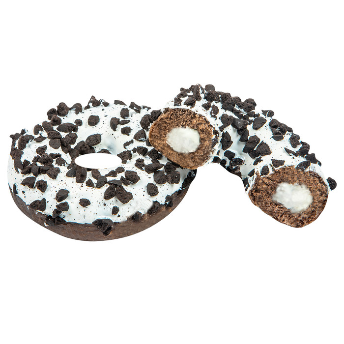 Донат с начинкой со вкусом ванили, декорированный белой глазурью и печеньем.