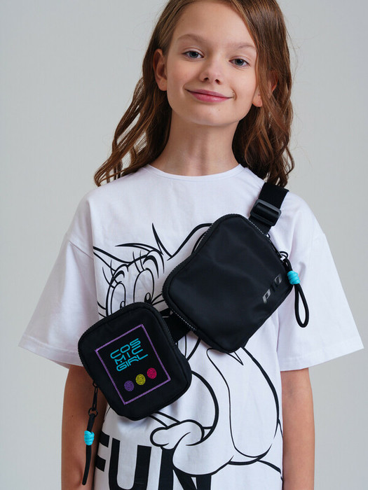 Оригинальная сумка для девочки-подростка с двумя отсеками-карманами на молнии. Можно носить как на поясе, так и как кросс-боди. Ремень регулируется. Параметры: высота - 13 см, ширина -28 см, глубина - 2 см.