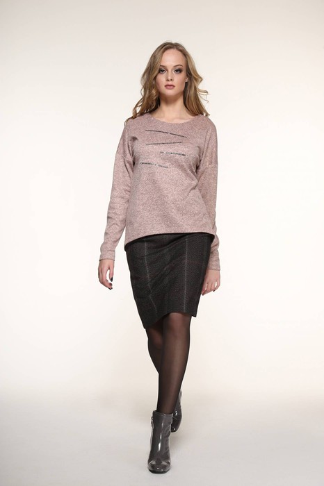 Свитшот из меланжевого трикотажа с термоаппликацией полоски букв на полочке по груди. Длина изделия на рост 164 - 62 см, 170 - 66 см, длина рукава на 164 - 70 см, 170 - 73 см.