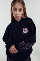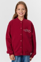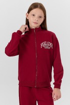 Свитшот прямого силуэта с втачными длинными рукавами, по линии низа имитация текстильной рубашки. Изделие выполнено из полотен контрастного цвета и разной текстуры, на полочке есть принт. Горловина круглая и обработана притачной бейкой. В качестве дополни