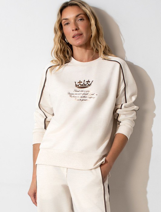 Состав: 95%Хлопок 5%ПУ Плотность: 240 Г/м2 Параметры модели на первом фото: Рост 172, бюст 88, талия 64, бедра 88 Размер товара на первом фото: 42Стильный свитшот овсяного цвета с эффектом меланж из премиального футера двухнитки с эластаном сочетает в себе комфорт и оригинальность. Джемпер выполнен из натурального хлопка, который обеспечивает мягкость и дышащие свойства ткани. Нежный материал дарит ощущение уюта в любое время года, а премиальное качество изготовления гарантирует долговечность и сохранение формы после множества стирок. Особенность изделия — спущенная линия плеча и аккуратные разрезы, которые добавляют современный акцент и делают образ более выразительным. Лампасы на рукавах добавляют наряду динамики и выделяют этот свитшот на фоне классических решений. Принт в виде надписи придает индивидуальность, позволяя выделиться без лишней вычурности. Перевод надписи:Think like queen Queens are not afraid of failure Failure is another stepping Stone to greatness - Думай как королева Королевы не боятся неудач, Неудача — это ещё один шаг К величию. Дополнен металлическим логотипом бренда. Представлена широкая размерная линейка, включая маленькие и большие размеры, что позволяет подобрать идеальный вариант для разной фигуры и роста. Этот уютный свитшот отлично подходит для повседневной носки благодаря своей комфортной посадке и мягкой текстуре. Он станет универсальным элементом гардероба, легко сочетающимся с различными стилями одежды. Свободный джемпер из футера станет отличным выбором для активного отдыха, обеспечивая стильный внешний вид и удобство в прохладное время года.