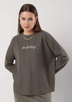 Женский свободный свитшот с длинным рукавом и круглым вырезом. Горловина обработана обтачкой из материала кашкорсе.