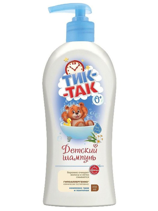 Детский шампунь Тик-Так с комплексом трав и пантенолом для бережного ухода за волосами и кожей головы ребенка.